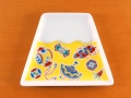 お皿の白い部分と絵の部分には段差があるので、例えば、絵の部分には醤油を、白い部分には薬味をのせて、