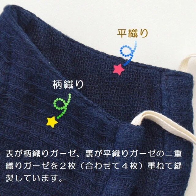 表が柄織りガーゼ、裏が平織りガーゼの二重織りガーゼを2枚重ね、合わせて4枚のガーゼを重ねて縫製しています。