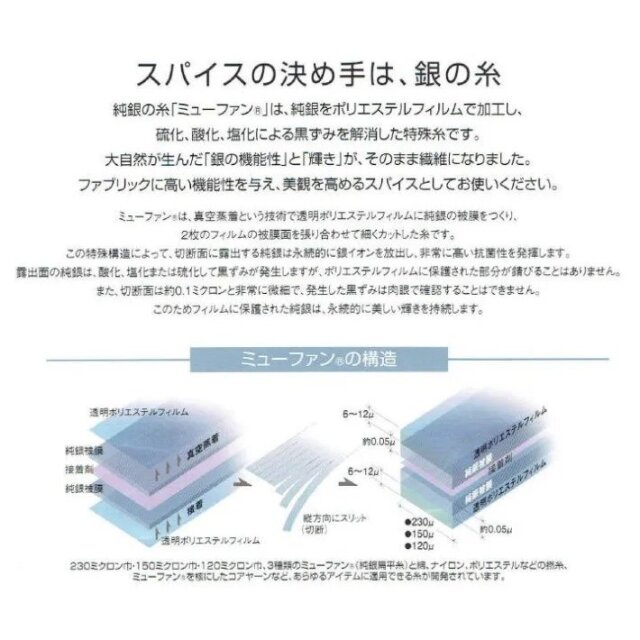 横糸に純銀の「ミューファン」を編み込んであり、銀の力で、抗菌・防臭・除電・熱遮断の効果が永続的に続きます。